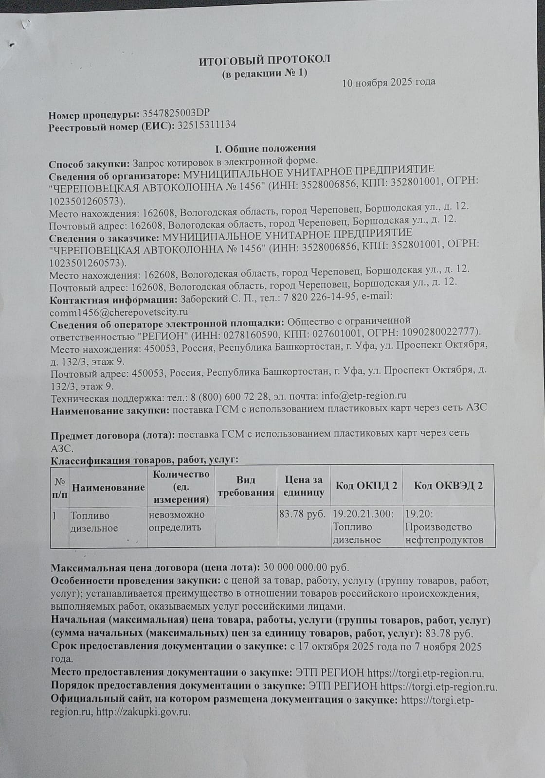 МУНИЦИПАЛЬНОЕ УНИТАРНОЕ ПРЕДПРИЯТИЕ "ЧЕРЕПОВЕЦКАЯ АВТОКОЛОННА № 1456" |